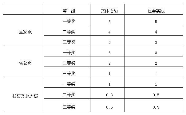 在全国学科竞赛中获得奖励者,按照一、二、三等奖的梯度分别加10、8、5分;在省级学科竞赛中获得奖励者,按照一、二、三等奖的梯度分别加5、4、3分;在校级学科竞赛中获得奖励者,按照一、二、三等奖的梯度分别加3、2、1分(以证书为准)。