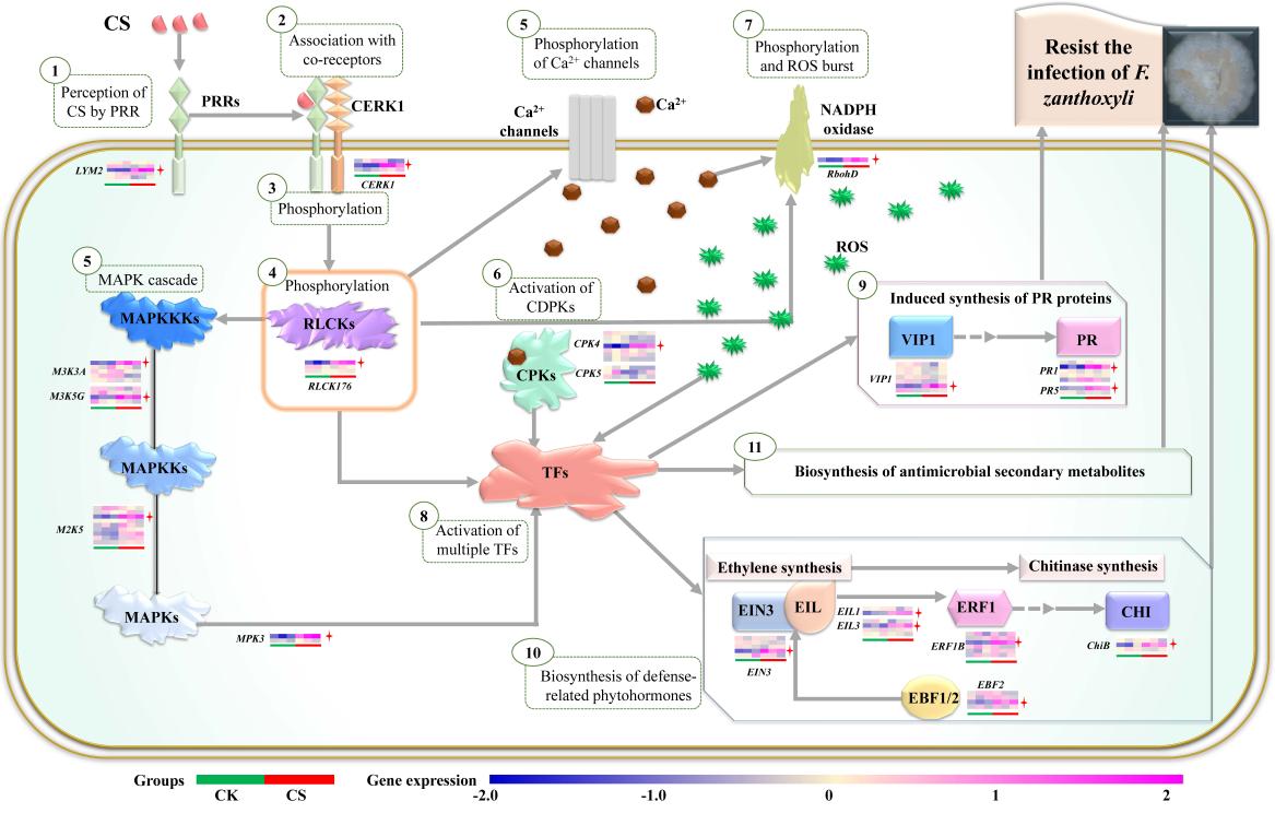 以“Exogenous priming of chitosan induces resistance in Chinese prickly ash against stem canker caused by Fusarium zanthoxyli”为题的研究结果发现外源壳聚糖(CS)能诱导花椒抵抗干腐病菌的侵染,CS可激活花椒先天免疫反应关键指标,促进活性氧的迅速释放,阐明了CS诱导花椒抗病性相关基因的表达调控网络,鉴定了参与CS在诱导花椒抗病性中的WRKY转录因子,明确了多个参与CS诱导抗病反应的关键基因的表达模式,相关基因的上调表达促进了防御酶活性的增强及抗病相关次生代谢产物的积累。研究结果为CS在林木病害系统中诱导抗性功能的利用奠定基础。